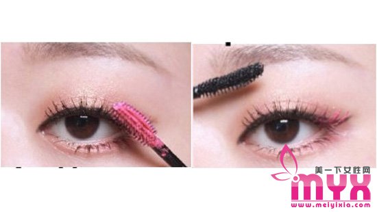 step9:用粉色眼睫毛膏z型刷上眼睫毛。